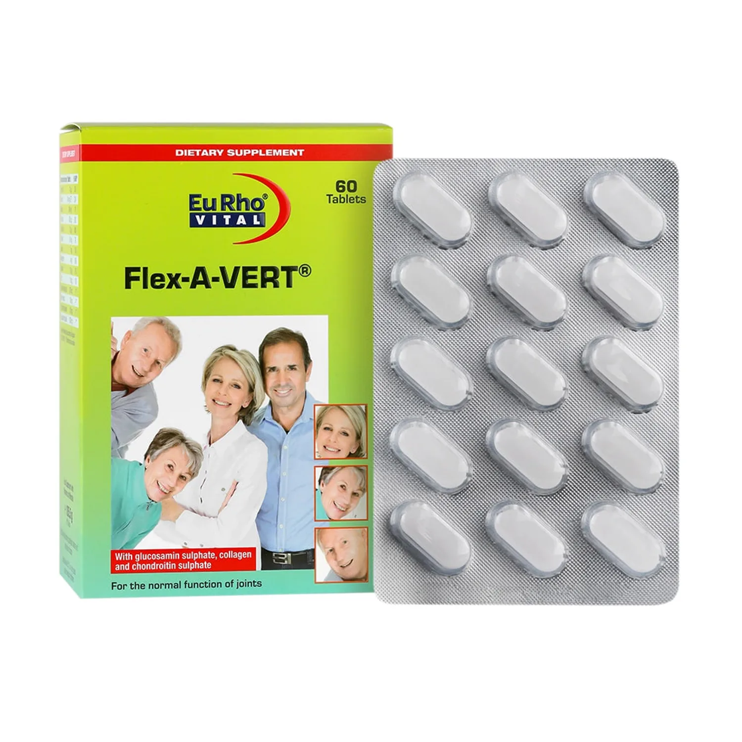 قرص فلکس اورت یوروویتال (Flex A Vert) محصولی از برند معتبر Eurho Vital است. تحت لیسانس شرکت Euro OTC Pharma GmbH آلمان تولید و در ایران توسط شرکت داروسازی هگمتان داروی غرب بستهبندی میشود. این مکمل در گروه غضروفسازها قرار دارد و با بهرهگیری از ترکیباتی نظیر گلوکوزامین، کندروئیتین سولفات، کلاژن هیدرولیز شده، عصاره زنجبیل، ویتامینها و مواد معدنی ضروری، بهصورت همهجانبه از مفاصل، غضروفها، استخوانها و عضلات حمایت میکند.